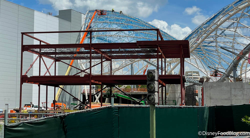 We also hopped on the monorail to EPCOT to see if we could spot any progress on the upcoming roller coaster, Guardians of the Galaxy: Cosmic Rewind, and it turns out that we did! The last time we got a birds-eye view we saw only the beginnings of the entrance to the attraction…