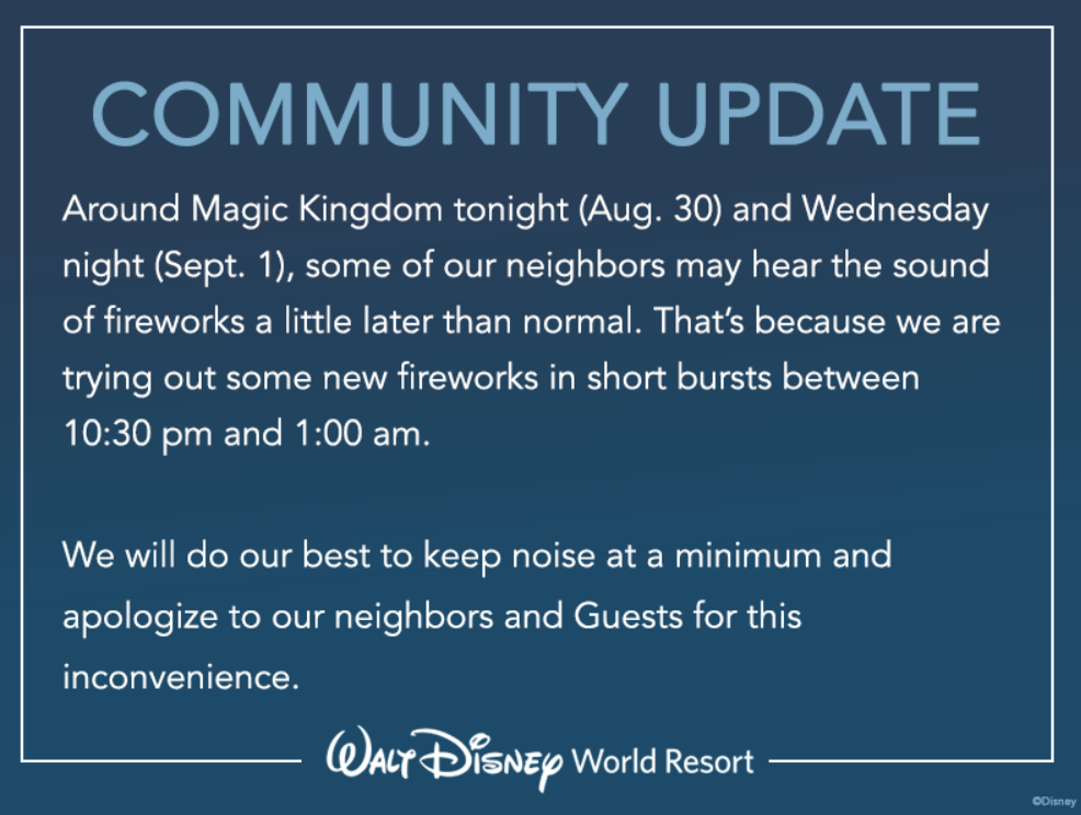 Disney has announced via Facebook that on the nights of August 30th and September 1st, they will be testing new fireworks at Magic Kingdom in short bursts from 10:30PM to 1AM.