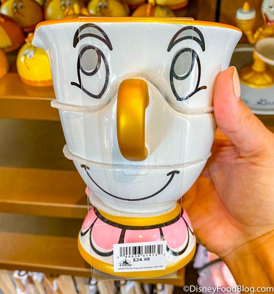 One of the cutest Beauty and the Beast kitchen items is the Chip Measuring Cup Set for $24.99. This set comes with four ceramic stackable measuring cups with Chip art on each one.