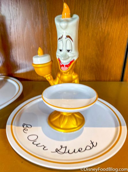 When it comes to the Belle Be Our Guest Collection inspired by Beauty and the Beast, you will find this Lumiere Serving Tray that comes with both a serving tray AND bowl. Everything is ceramic, and “Be Our Guest” is written on the serving plate.