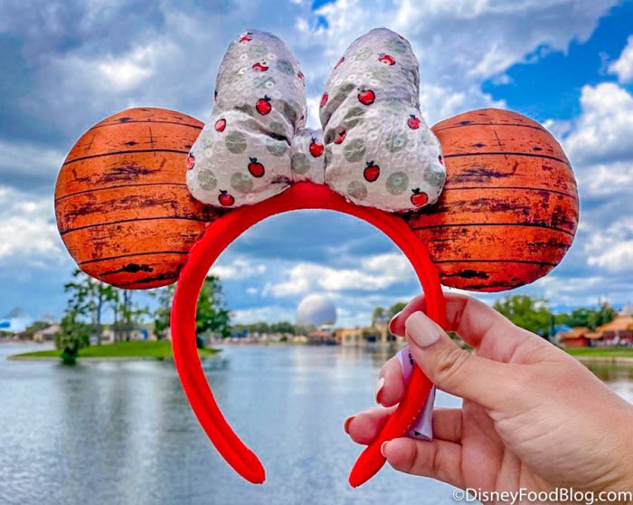 The 2021 EPCOT Food and Wine Festival Minnie Ears are online now too! The ears are meant to resemble wooden apple crates, and the Minnie bow is covered in clear sequins with an apple and polka dot print.