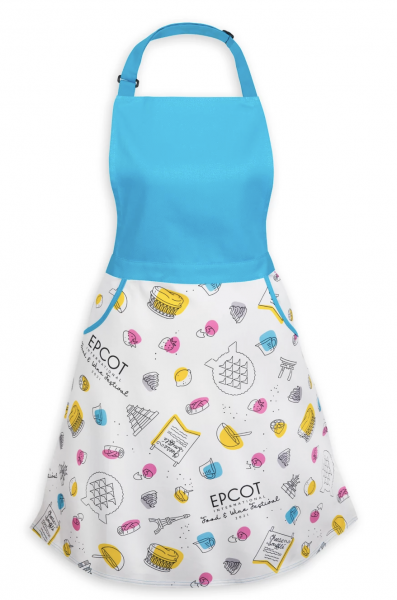 Or if you’d rather dress like Belle, you could get the Belle Apron for $29.99. This apron has a contrasting blue top with a patterned apron skirt. The pattern features a special 2021 EPCOT Food and Wine Festival print, including images of Spaceship Earth and food items.