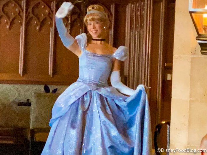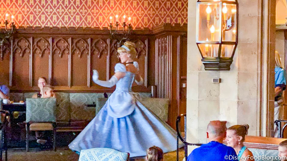 She doesn’t meet and greet with guests at their tables, nor does she walk through the restaurant. Instead, Cinderella comes out of one area, stands on an upper portion of the restaurant, and walks around that slightly elevated area.