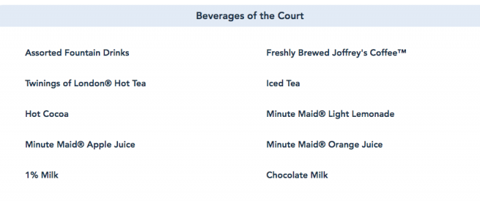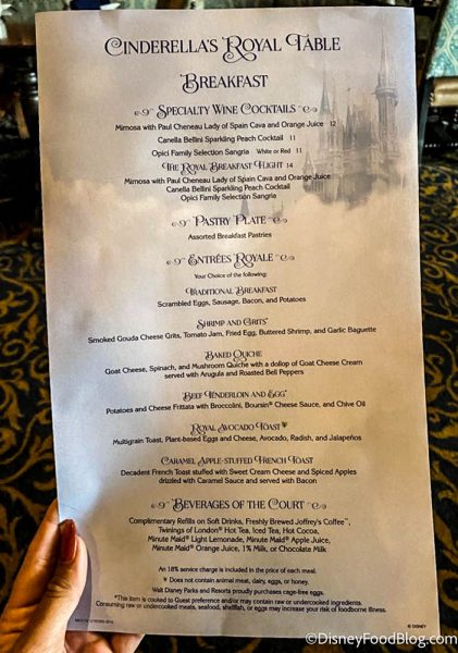 Here’s a closer look at the full breakfast menu for Cinderella’s Royal Table. Breakfast is priced at $42 per adult and $27 per child. Keep in mind that lunch and dinner are priced at $62 per adult and $37 per child.