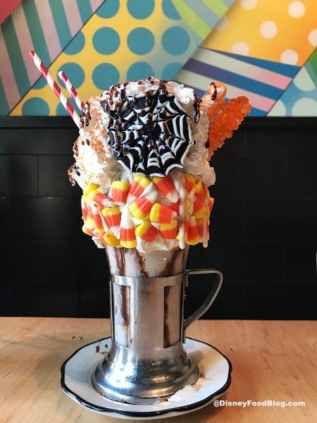 - Halloween CrazyShake – Chocolate shake with a vanilla frosted rim with candy corn topped with a “spider-web” chocolate cupcake, orange and white twisty pop, orange rock candy, whipped cream, orange sprinkles, and a chocolate drizzle (available Oct. 28-31)