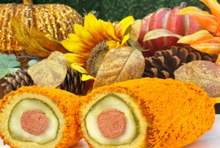 - Cheddar Pickle Dog – Kosher pickled corn dog rolled in a cheddar cheese blend