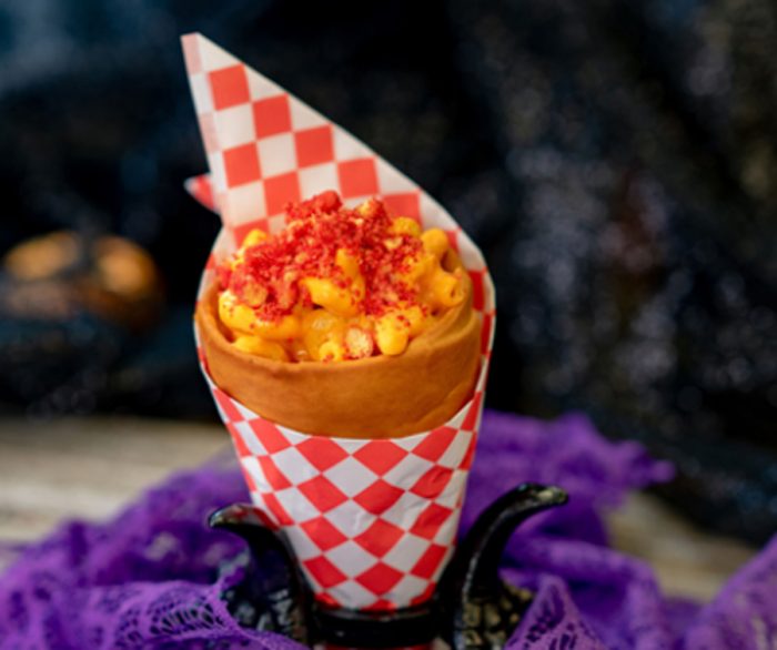 - Spicy Mac & Cheese Cone – Pasta with spicy red pepper-cheese sauce topped with crushed chile-cheese puffs served in a bread cone