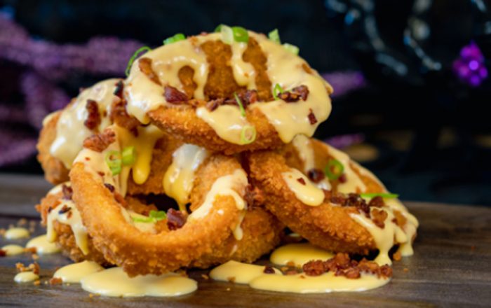 - Loaded Onion Rings – Onion rings topped with a creamy cheese sauce, crispy bacon, and green onions
