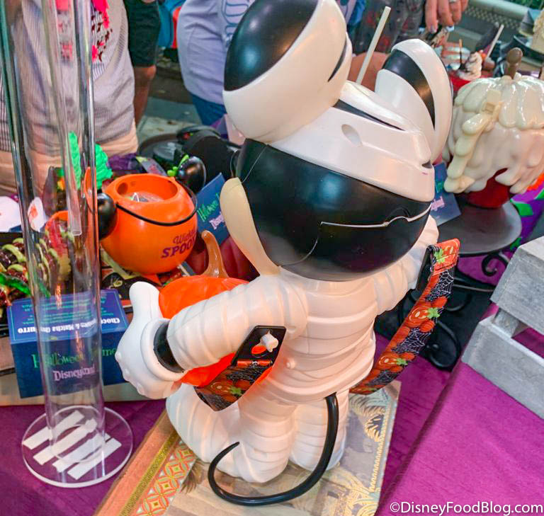 The popcorn bucket features Mickey dressed up as a mummy, holding onto a jack-o-lantern in one of his hands.
