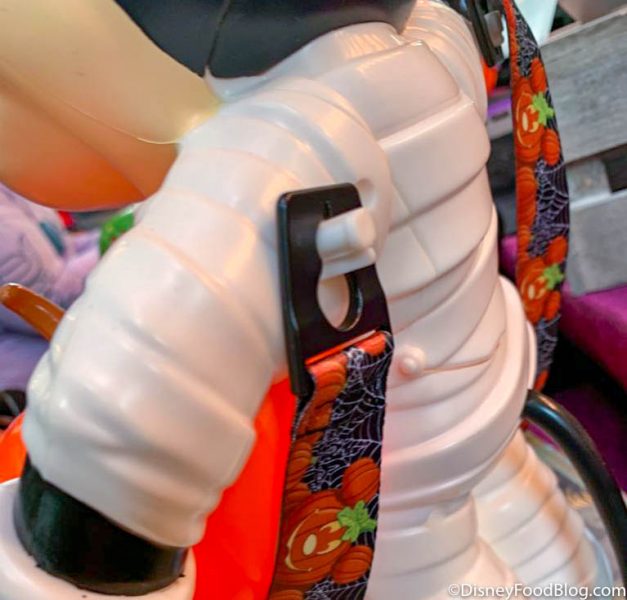 On the back, you can see where the straps attach to this popcorn bucket so you can carry Mickey (and your popcorn) around with you all day.