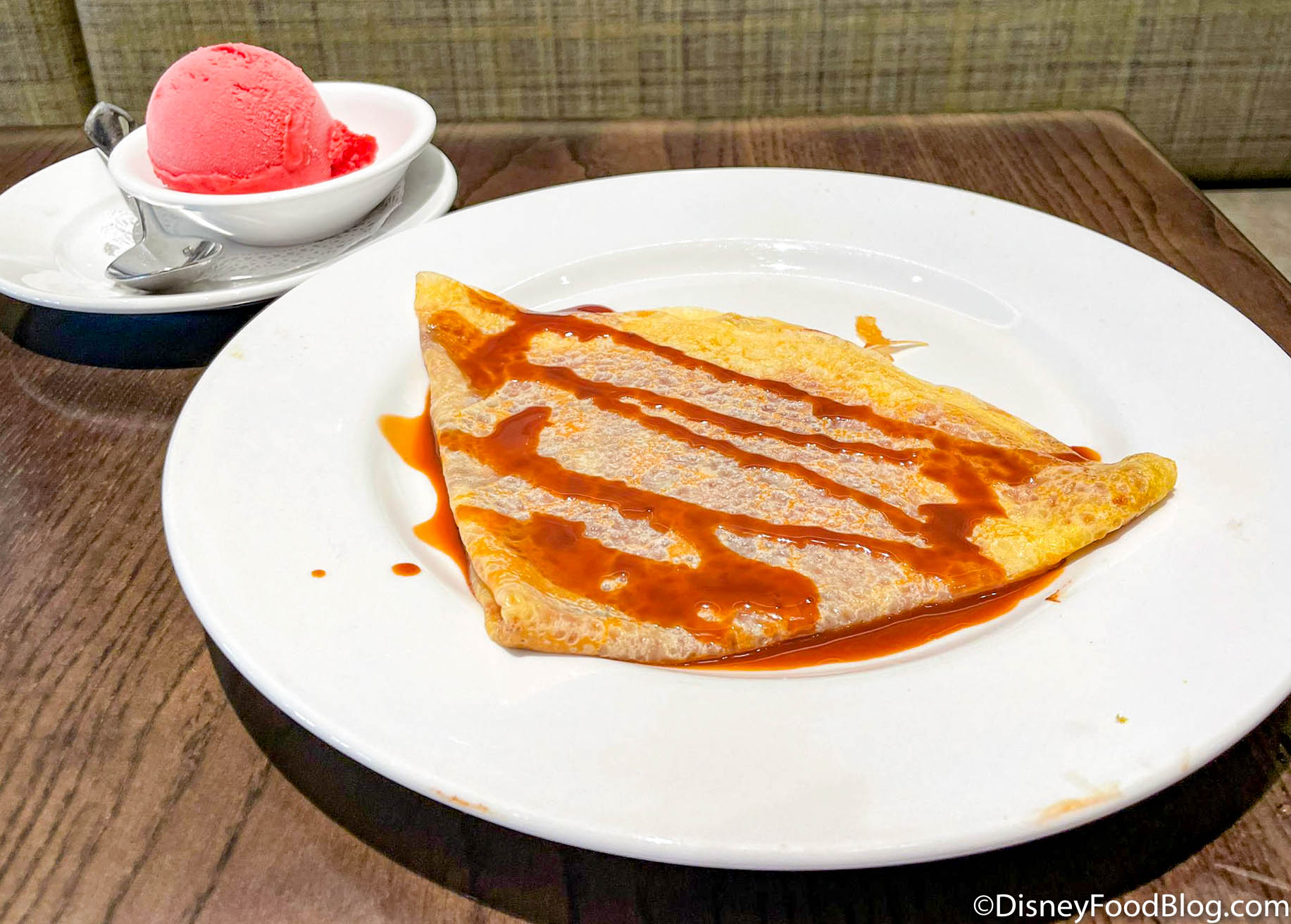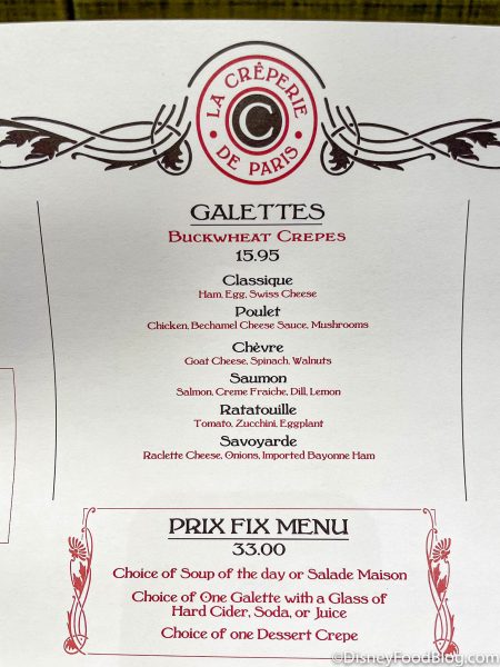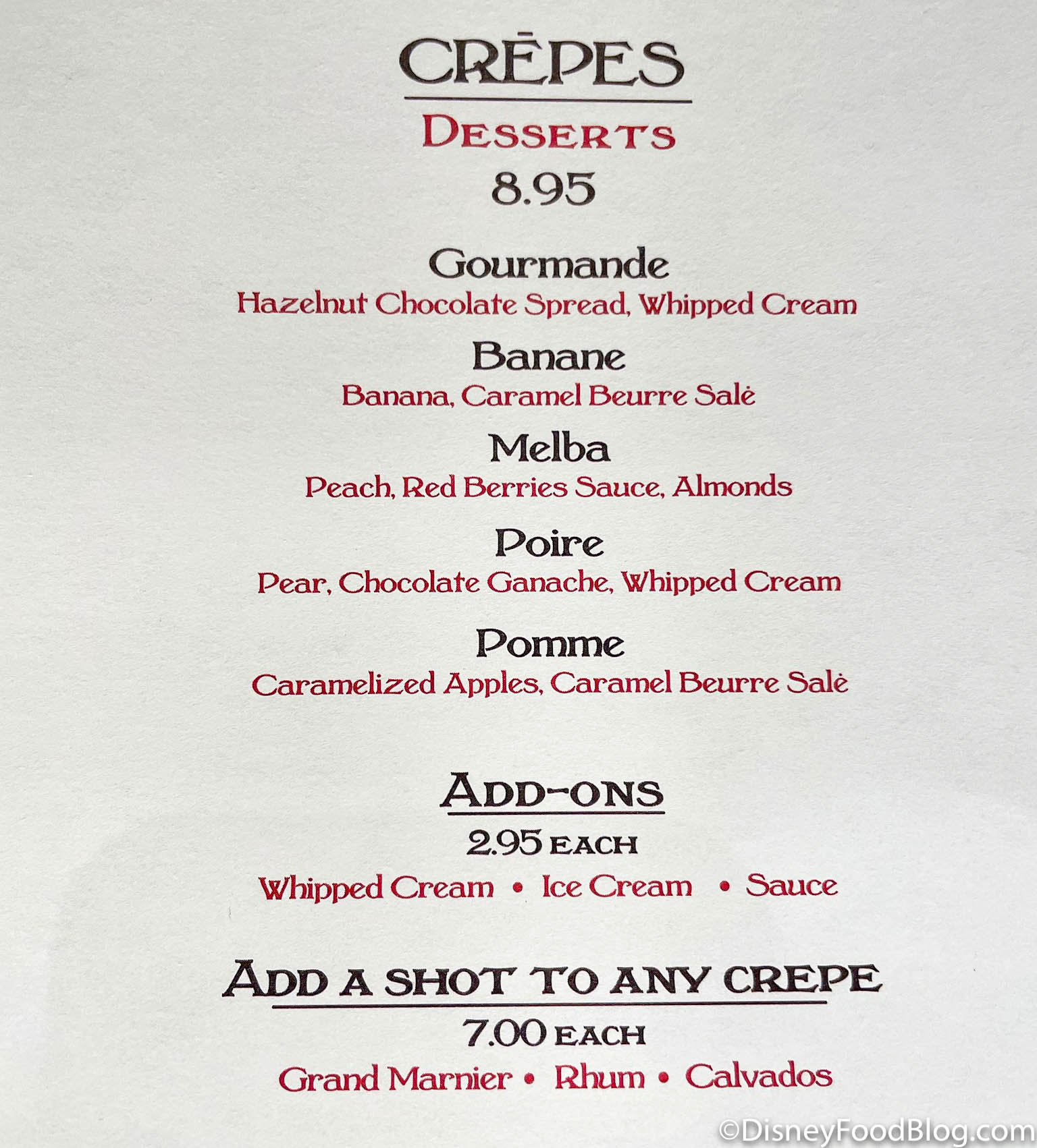 - You’re not a crêpe fan or a buckwheat galette fan, or you’re looking to eat a LOT of heavy food — If you don’t love crêpes or you don’t like the idea of buckwheat galettes, but you still want to munch on some French flavors, then you’ll probably want to skip this spot and visit Les Halles instead. Also, if you’re looking to eat a TON of food, this probably isn’t the best option. There are a variety of menu options, but overall the galettes and crêpes are light and thin. If you’re looking to really eat tons of food or eat a heavier meal, a buffet or family-style service meal at EPCOT will probably be a better choice.