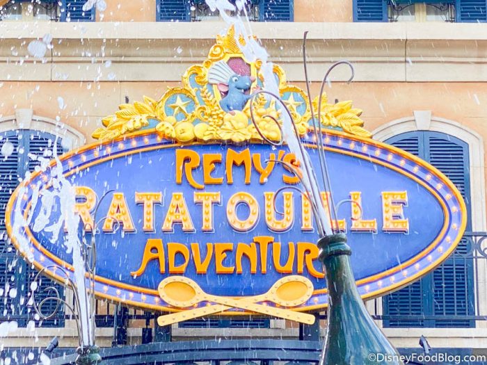 We’ll be showing you around the WHOLE expansion in GREAT DETAIL — but right now, we’re focused on Remy’s Ratatouille Adventure! Check out that ah-mazing marquee.