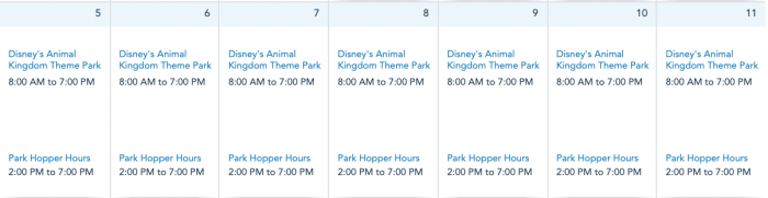 Finally, Disney’s Animal Kingdom will be open daily next week from 8AM-7PM.