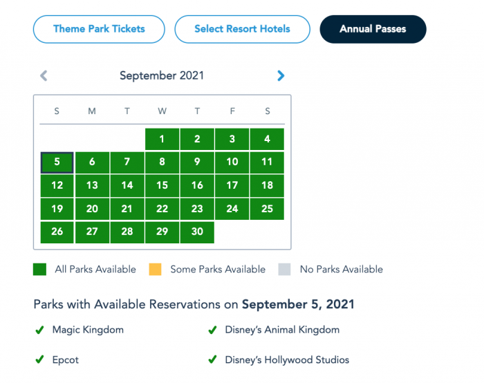 Finally, Annual Passholders can book a Park Pass Reservation at any of the four theme parks for the entire week of September 5th as of this writing!