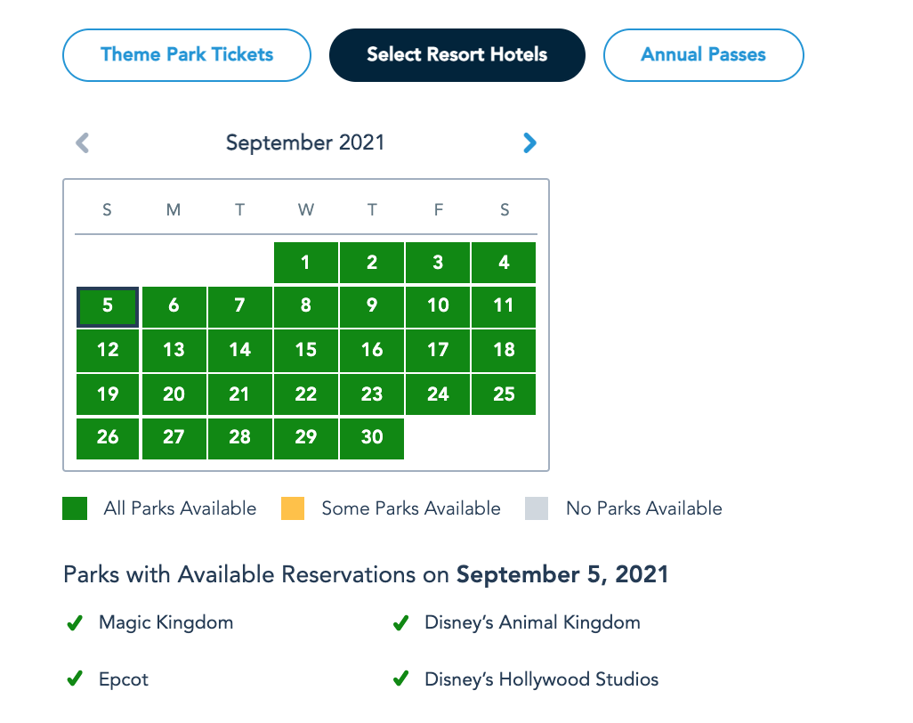 Park Pass Reservation availability for guests staying at Select Resort Hotels on September 5th as of September 1st © Disney