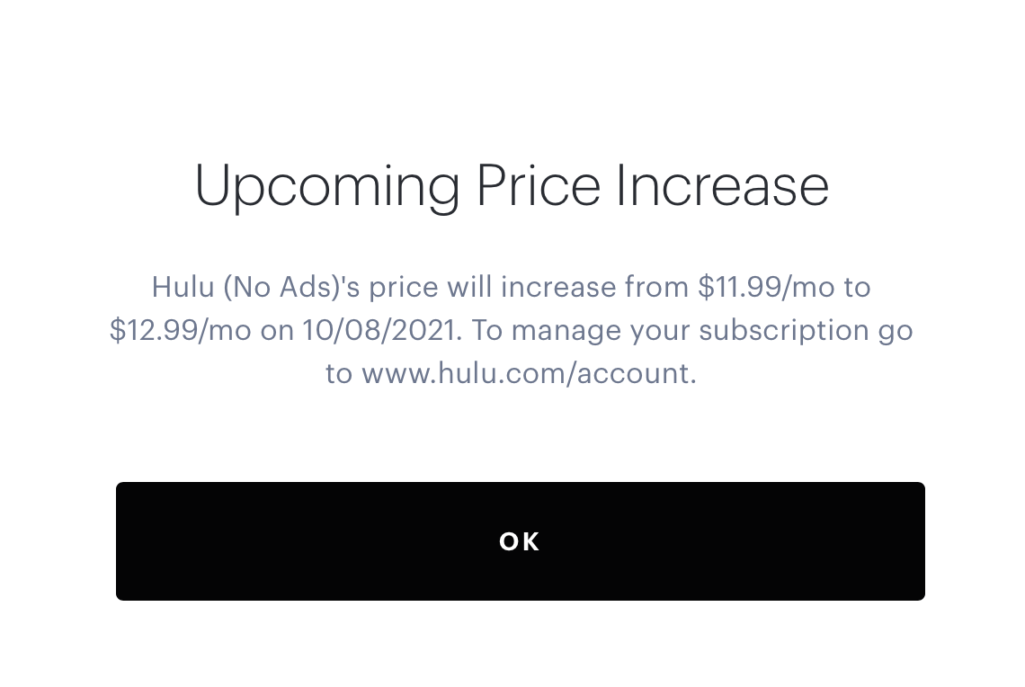 Hulu’s price increase will affect both tiers of streaming — the with-ads version and the no-ads version. The basic (with-ads) version will increase from $5.99/month to $6.99/month. The premium (no-ads) version will increase from $11.99/month to $12.99/month. These changes go into effect on October 8th, 2021.