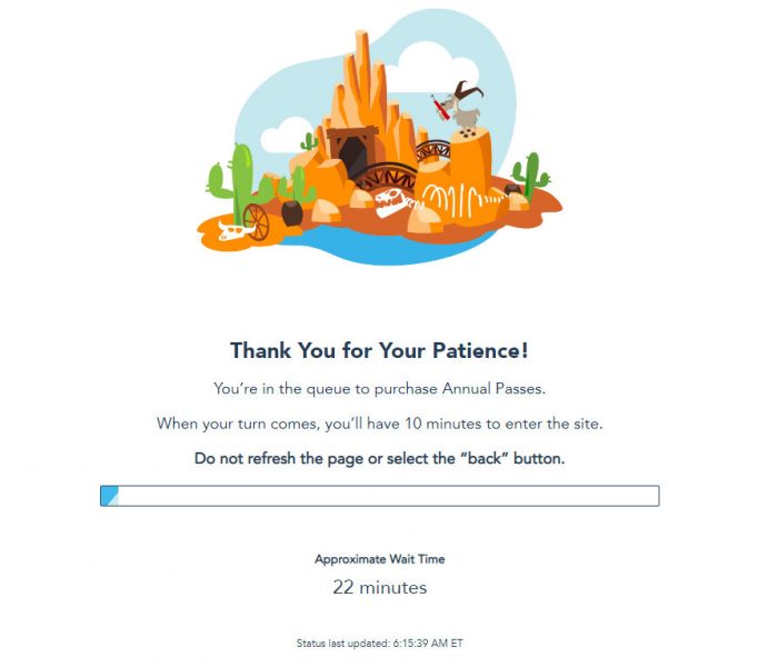 Depending on what time you visit the Disney World website to purchase an Annual Pass, you may enter a Queue. (This screenshot was taken at 6:15AM EST, for example.)