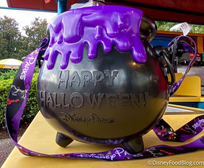 The back of the bucket says Happy Halloween under the dripping purple potion and it comes with a lanyard featuring Mickey and friends in their spooky Halloween costumes.