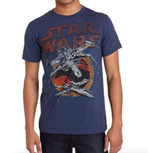The t-shirt is blue with a graphic of a Star Wars X-Wing Fighter on it. You can get this tee for just $13.14 on Amazon now!