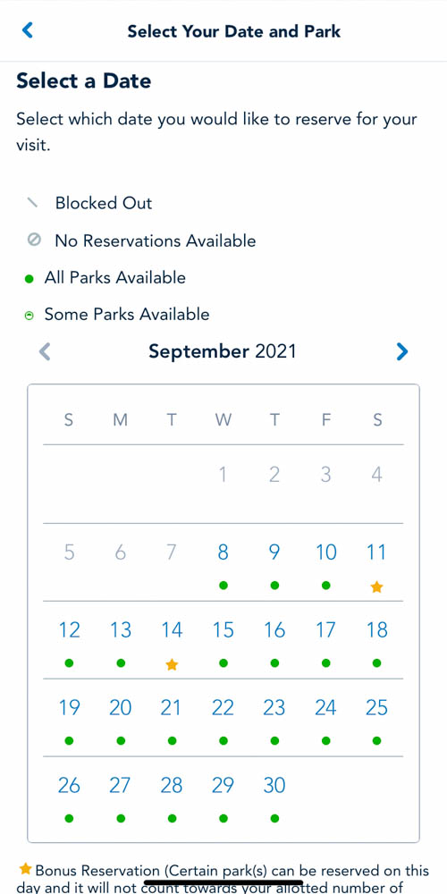 For certain days, you may also see a yellow star, which is a bonus reservation. That means you can make the park pass reservation without it counting towards your limit of pass reservations. For instance, guests with an existing gold annual pass can now make five park pass reservations. But they could make more than five reservations if the extra ones are bonus (they have the gold star by the date).