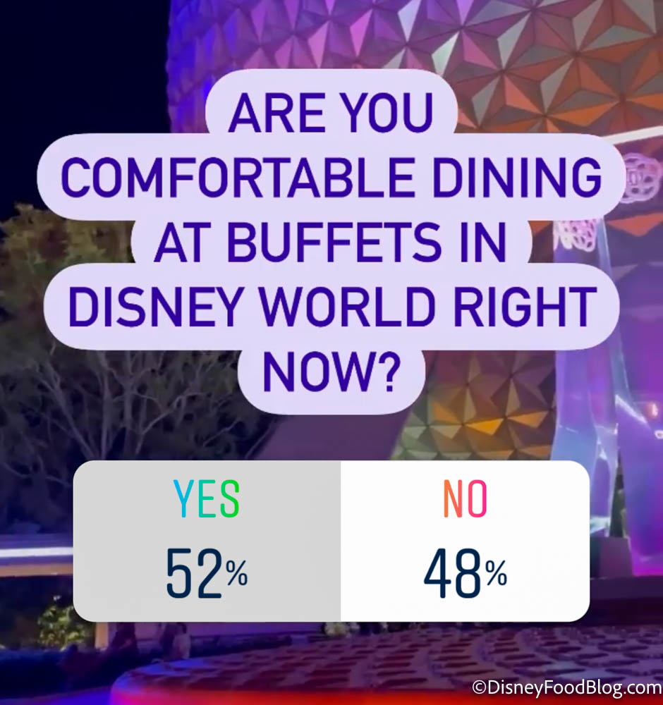 We polled ou10,000 Readers Are SPLIT on the Return of Buffets in Disney World!r readers on Instagram with the question “Are you comfortable dining at buffets in Disney World right now?” We got more than 10,500 responses — and the results were almost 50/50.