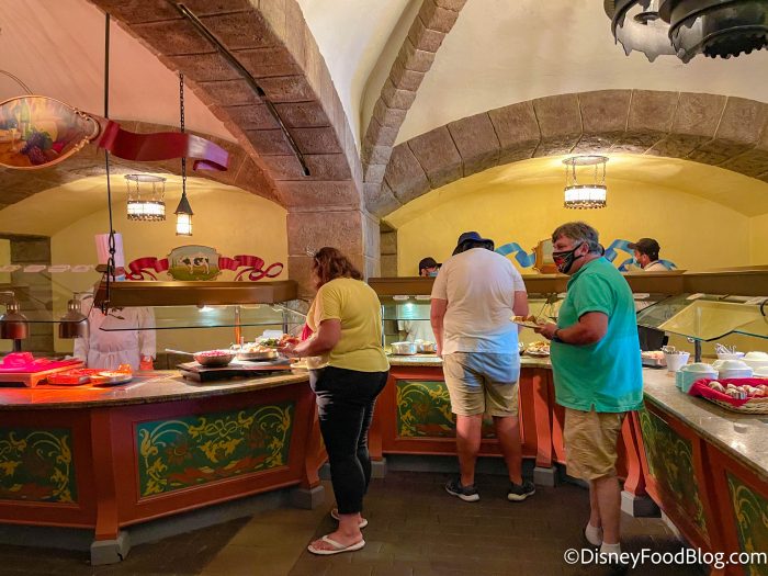There are some safety measures like mandatory face masks and some extra cleaning, but there’s also more interaction at the buffets, and we didn’t see Cast Members cleaning utensils between guests.