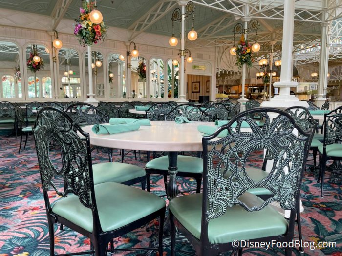 The inside of the restaurant is very Victorian, with lots of windows and soaring ceilings. There is plenty of light here. You’ll also see some decor that made a little more sense when this was a character dining spot with Pooh and friends (and note that character dining has still not returned here).