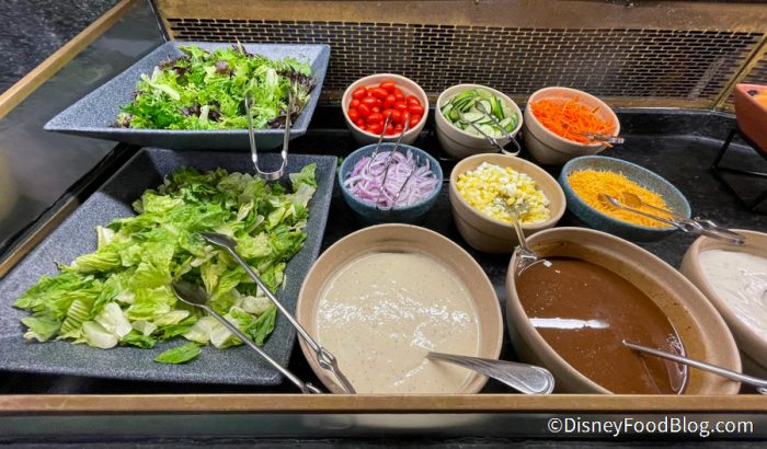 Crystal Palace’s buffet menu includes Soups, such as Walt’s Favorite Beef Chili, as well as salads, including Seasonal Fruit Salad, Waldorf Salad, and everything you need to Create-Your-Own Salad with greens, various toppings, and dressings.