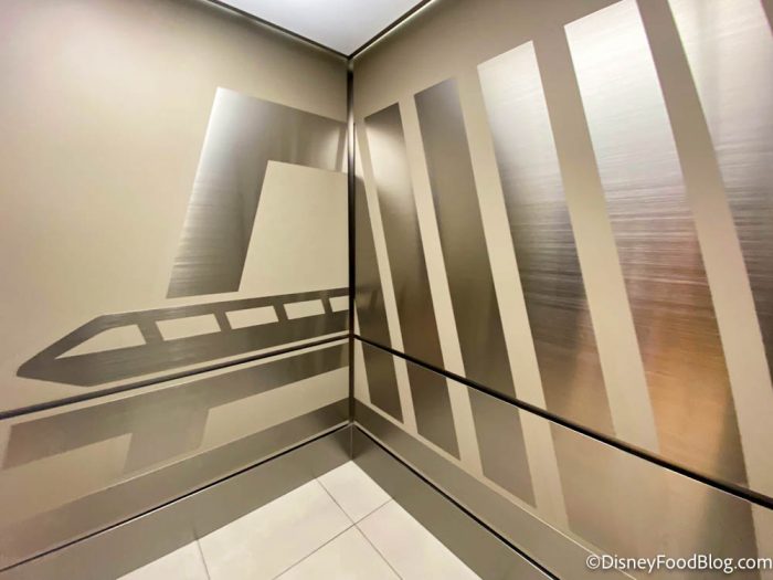 Lastly, we spotted the first signs of the sleek new styling coming to Disney’s Contemporary Resort! At the beginning of the week, we noticed that the elevators to the monorail platform were out of service, but it wasn’t too long before they reopened with a NEW look inside!