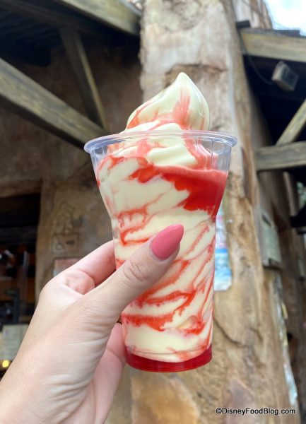 It’s a refreshing Pineapple Dole Whip with Watermelon, Strawberry, and Coconut-flavored Syrup, giving it a beautiful color and layers of tropical, fruity flavor that honestly gives Aloha Isle in Magic Kingdom a run for its money. See for yourself for $5.49! If you’re feeling sassy, you can upgrade for $10 to the King’s Cooler — the same float with a dousing of Parrot Bay Coconut Rum!