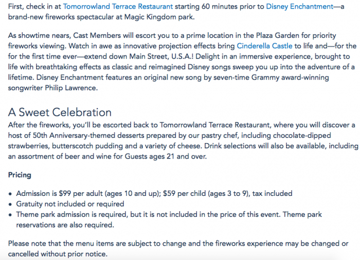 This is similar to the Fireworks Dessert Party — Plaza Garden Viewing option that was available in Magic Kingdom before. This was previously priced at $79 per adult and $47 per child, so this updated offering is a bit more expensive at $99 per adult and $59 per child.