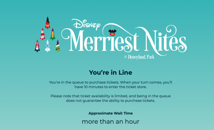 But, you’ll want to move quickly, because the virtual queue is already at over an hour to purchase tickets and the event only takes place on a limited number of nights. Recently, we saw the Oogie Boogie Bash sell out in Disney California Adventure, so we’ll have to keep you updated on availability now that Merriest Nights reservations are open as well.