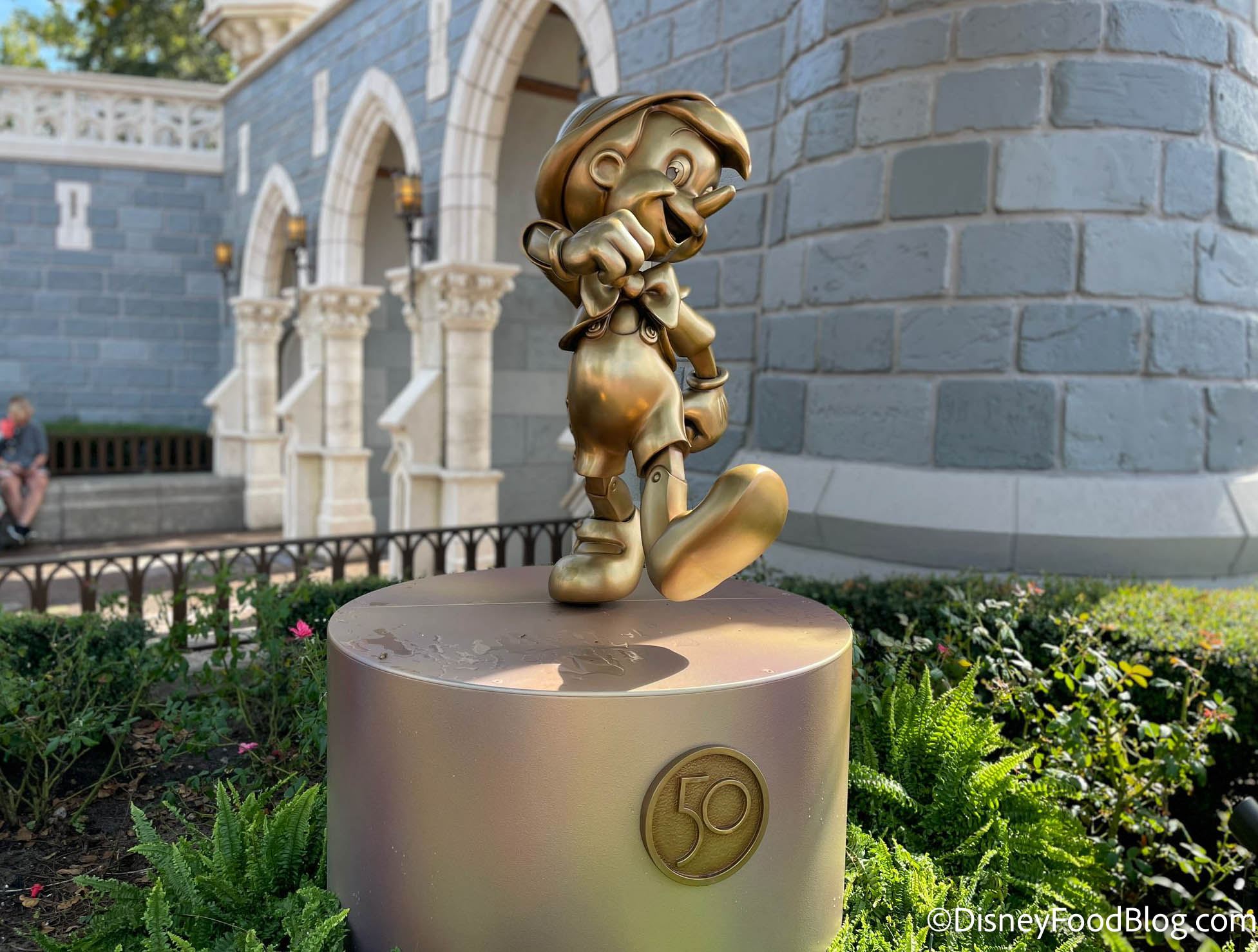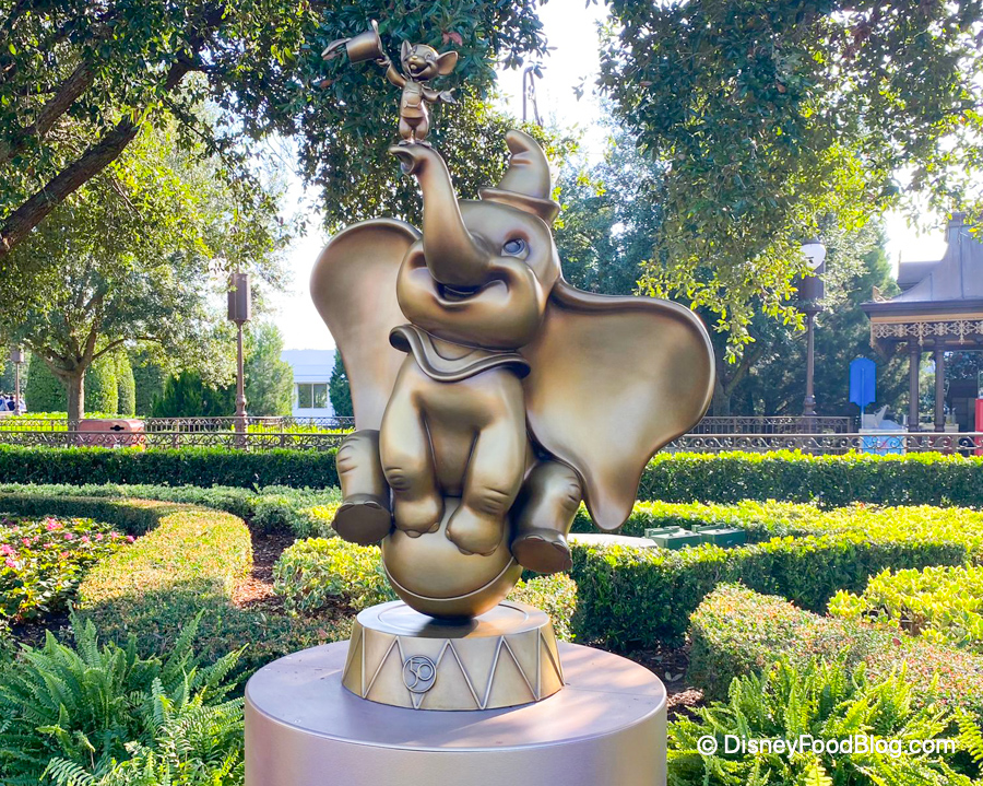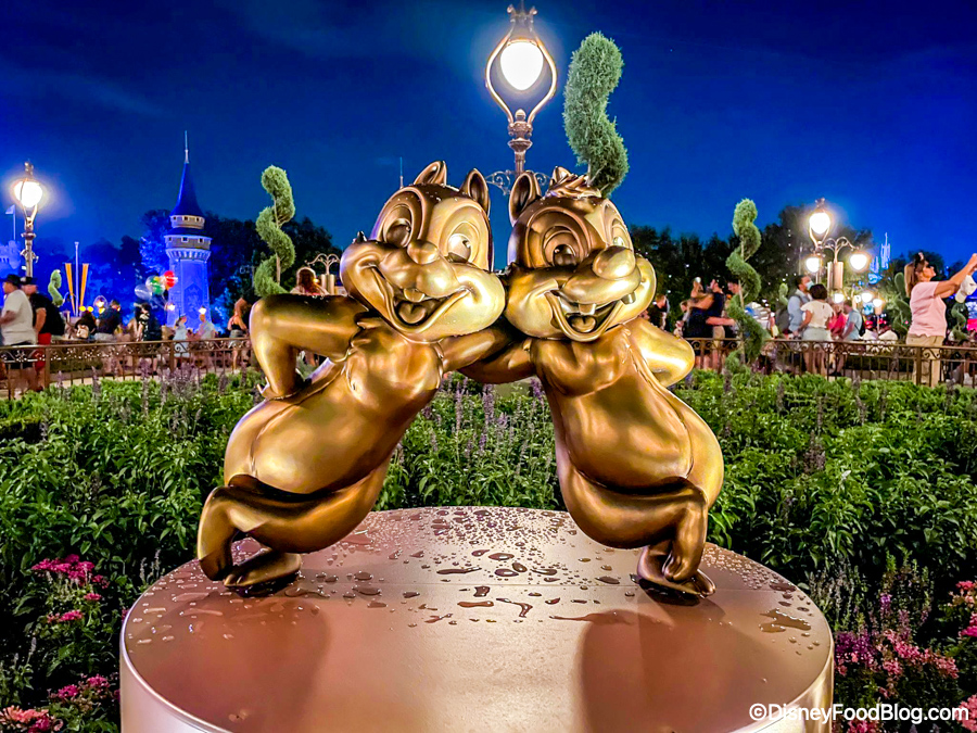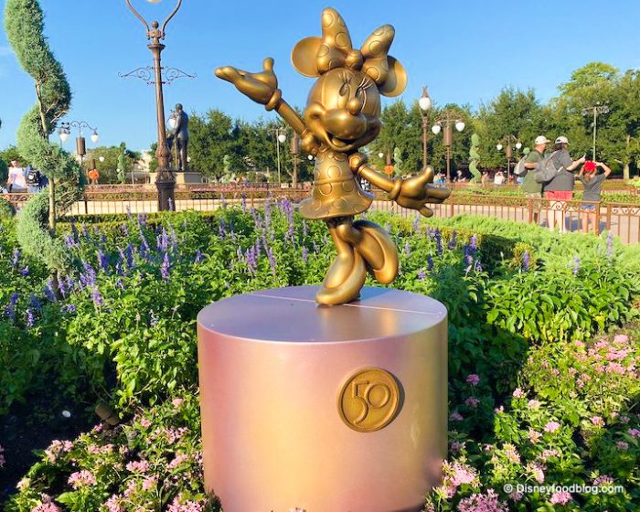 Many of the golden character statues for Disney World’s 50th anniversary have been installed in Magic Kingdom! We found many of them around the Hub, like Mickey…