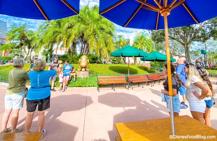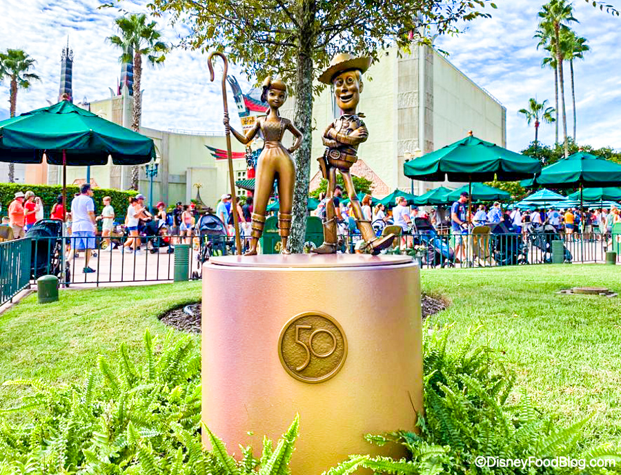 We’ve seen the parks getting ready for the big celebration by adding special new decorations like banners, signs, and a stage. Cinderella Castle also got a makeover and is ready for her birthday! 50 golden character statues are being added around the parks, too. We’ve seen statues pop up at Magic Kingdom, EPCOT, and Animal Kingdom, and now, Hollywood Studios is joining in on the fun, and we think they’re the perfect place for park photos!
