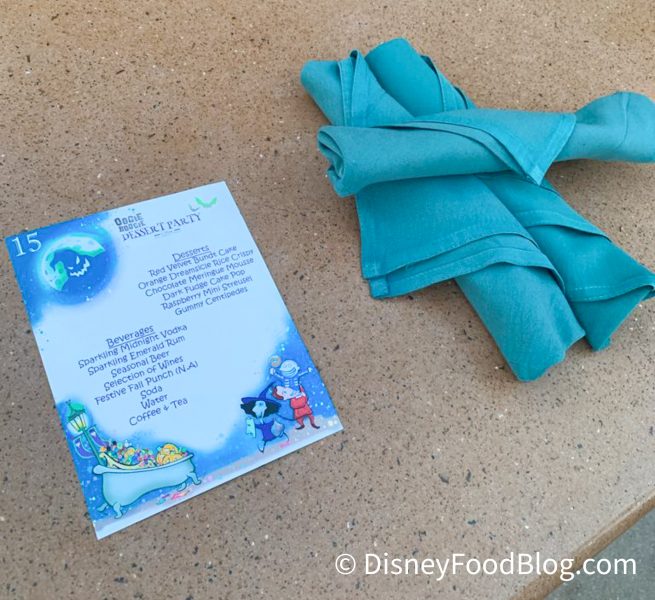 There are two dessert parties each night of Oogie Boogie Bash, with each one tied to one of the parade times that evening. We attended the first party of the evening set for the 7PM parade, which meant we could arrive at Sonoma Terrace 45 minutes prior to the start of the parade, at 6:15PM. We arrived right on time and we were brought to our table!