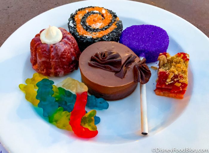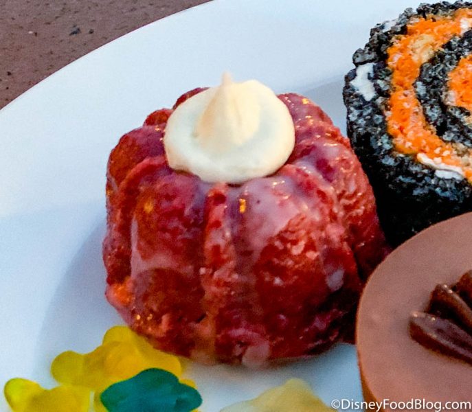 All of the desserts were brought out to us at one time on a plate, giving you the option to try a little bit of everything. As far as the desserts go, they were all pretty good. The desserts available include a Red Velvet Bundt Cake, an Orange Dreamsicle Rice Crisp, a Chocolate Meringue Mousse, a Dark Fudge Cake Pop, a Raspberry Mini Streusel, and Gummy Centipedes!