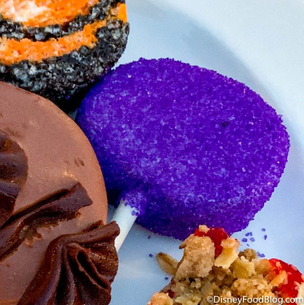 The Orange Dreamsicle Crisp had a unique look to it, but it was just alright. We didn’t pick up much of the orange flavor, and we found that it was harder to bite into it than the other Rice Krispies you can get around the parks. Major props for cuteness though. The black and orange swirl was really fun!