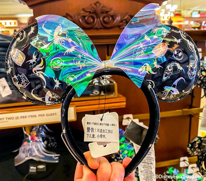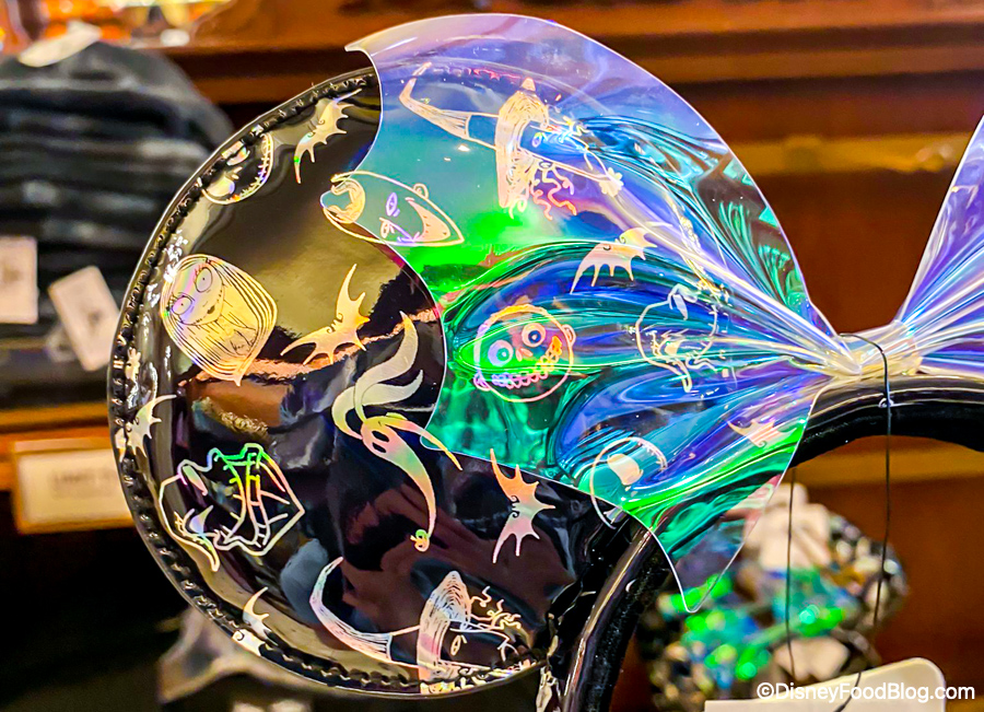 It features an iridescent bow (that looks like a bat to us!) and the many faces of the Halloweentown residents on the ears.