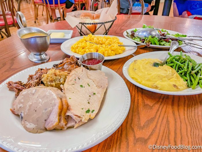 Like we mentioned above, this restaurant serves your meal up family-style at this time! On the menu, you’ll first be served a Tossed Salad, followed by your main course. The entrees and sides include Roasted Turkey Breast, Oven-Roasted Pork with Mashed Potatoes, Herb Stuffing, Pot Roast, Seasonal Vegetables, and House-made Macaroni & Cheese.