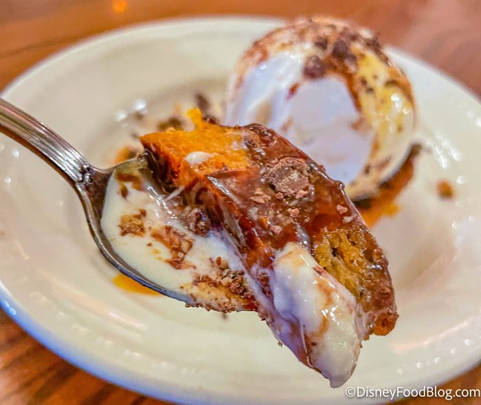 It comes topped with ice cream and the various temperatures and textures just all blend so well together. Warm caramel and chocolate, cold ice cream, hot cookie. 😍 We’d come back again and again just for this cake! Oh wait, that’s right — it’s basically always been our absolute favorite part of a meal at Liberty Tree Tavern! Seriously, we can’t understate how ROCK SOLID this slammin’ dessert is.