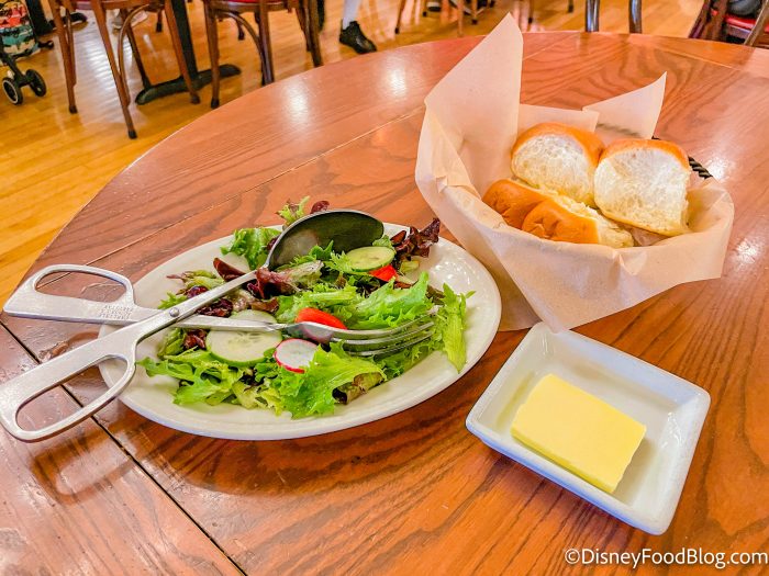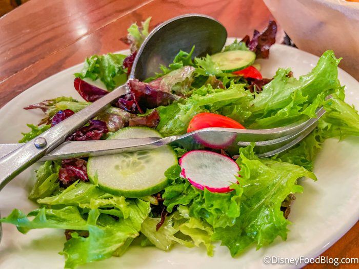 Alright, now it’s officially time to dig in! We’re kicking things off with the Tossed Salad which (SURPRISE!) came with an order of dinner rolls and butter on the side.