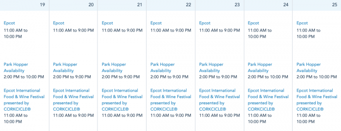 EPCOT will be open from 11AM-9PM Monday through Thursday, and it will be open from 11AM-10PM on Sunday, Friday, and Saturday as we’ve seen in weeks past. The EPCOT International Food and Wine Festival is continuing next week daily.