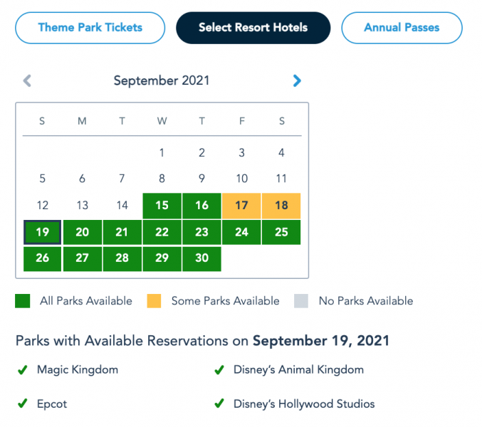 Park Pass Reservation availability for guests staying at Select Resort Hotels for September 19th as of September 15th © Disney