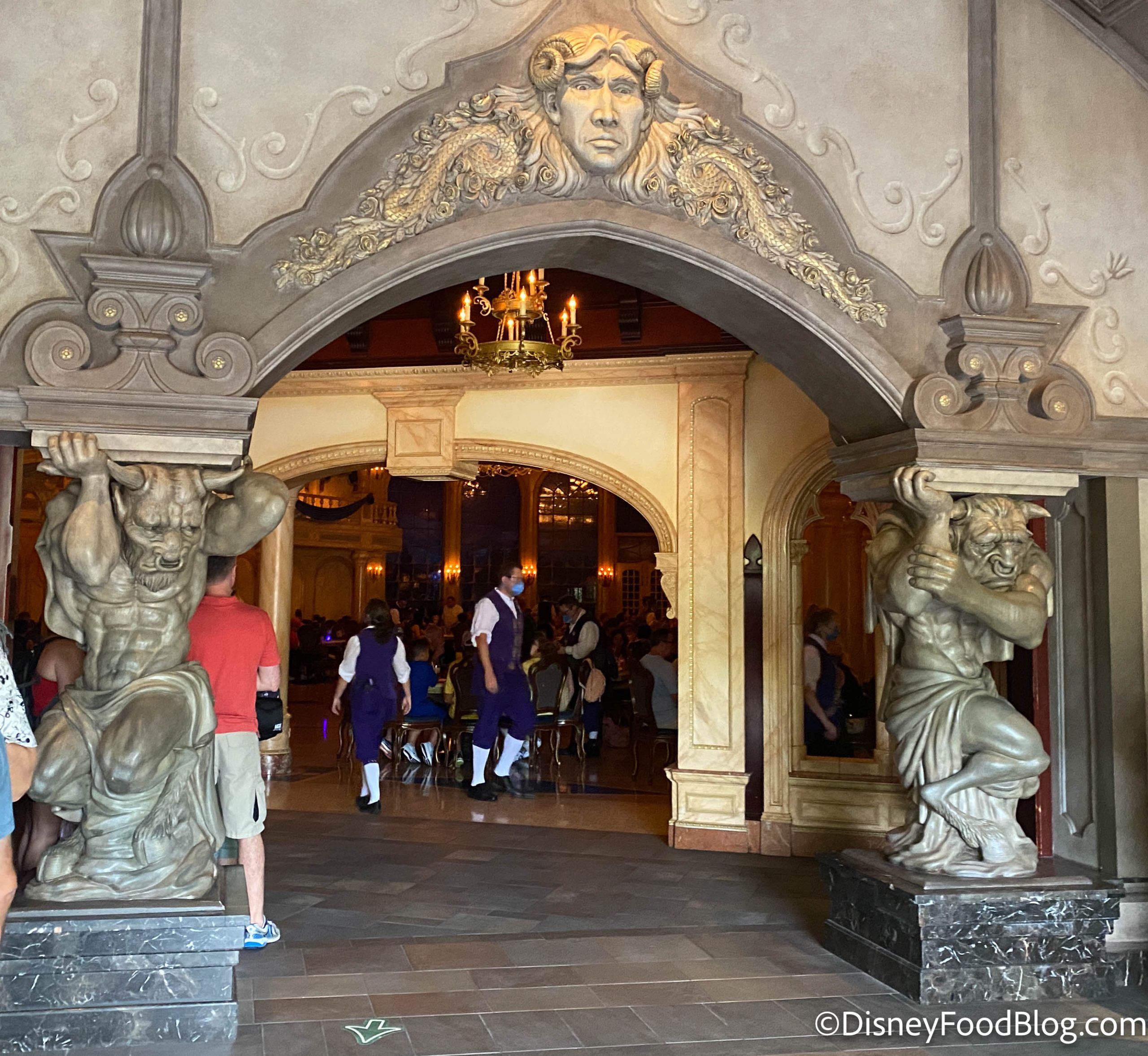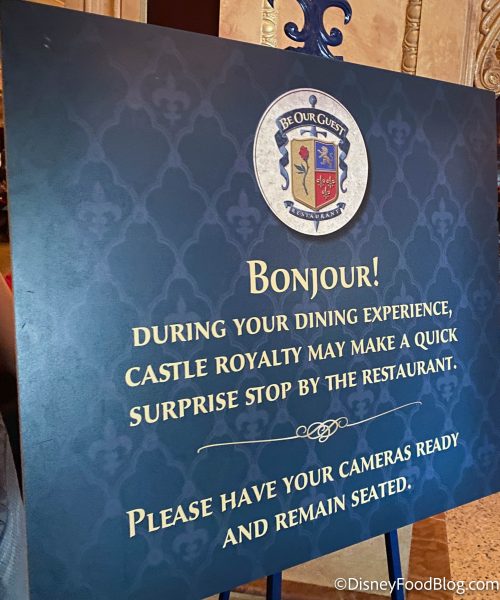 In the Grand Ballroom, you will find a sign that addresses the Beast’s “quick surprise stop” in Be Our Guest Restaurant.