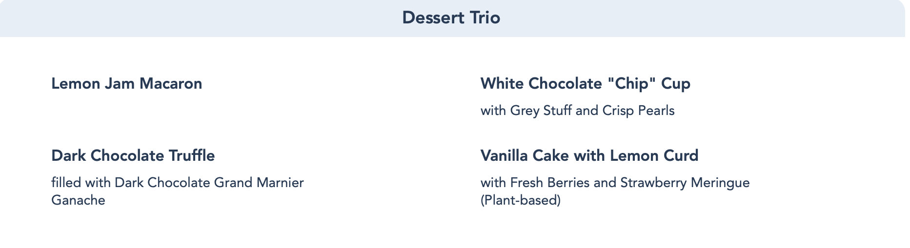 The Dessert Trio is served to each guest. It includes a Lemon Jam Macaron, a White Chocolate “Chip” Cup filled with Grey Stuff, and a Dark Chocolate Truffle. There is also a plant-based Vanilla Cake with Lemon Curd available.