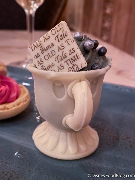 Chip was an edible white chocolate cup full of the deliciously famous grey stuff (AKA cookies and cream mousse), crisp pearls on top, and a white chocolate square with the famous Beauty and the Beast lyrics “tale as old as time” written on it. We know that Chip is adorable and a classic, but we’d prefer a bigger serving of the grey stuff and a little less white chocolate. We’ve seen him painted in the past, but he was just a solid white chocolate chip cup this visit. But kiddos and Beauty and the Beast will love this cute enough-to-eat dessert. Plus, if you go to Be Our Guest and DON’T eat Grey Stuff, did you really even go to Be Our Guest??