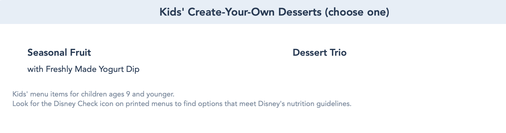 The desserts available to kids are either Seasonal Fruit or the Dessert Trio.