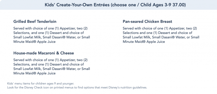 The Kids’ Menu is available to children nine and younger for $37 and the appetizers include Iceberg Wedge Salad, Fruit and Cheese Plate, and House-made Peach Applesauce.
