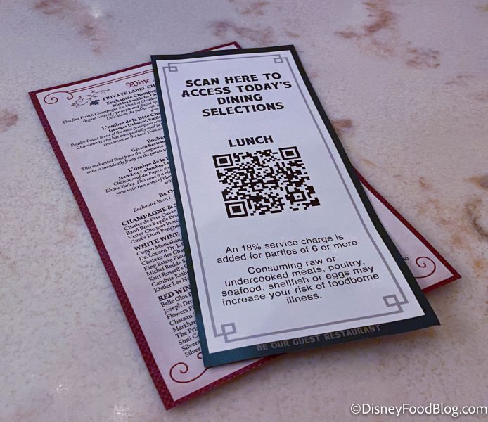 The prix fixe lunch/dinner at Be Our Guest Restaurant allows adult guests a choice of an appetizer, entree, and dessert, for $62. Children under 10 are $37. The lunch menu was available via QR code.