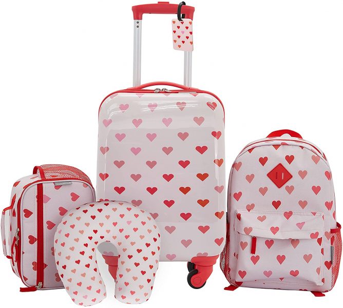 The set comes with an 18-inch hard-side carry-on, a backpack, a lunch bag, a neck pillow, and a luggage tag!